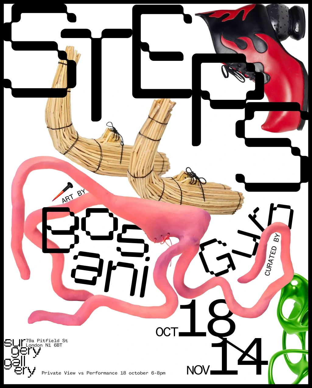 Bosani’s work goes in unexpected directions and in different ways: stepping back into their family’s lineage of shoemaking and the broader history of craft, they derive new affirmations in both material and social dimensions, examining how we encode gendered economies and how the rhythms these structures impose can separate or unite us as social beings. In attending to the material conditions of stepping, Bosani explores how movements are shaped by invisible architectures of power, and how craft knowledge might be mobilized to reimagine the choreographies of belonging.